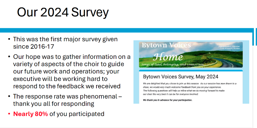 Every few years, the Bytown Voices Executive Committee conducts a survey of choir members. The results are used to guide our future work and operations. The most recent survey was May 2024. This initiative was led by Vice-President Catherine Smith. Response rate was almost 80%!